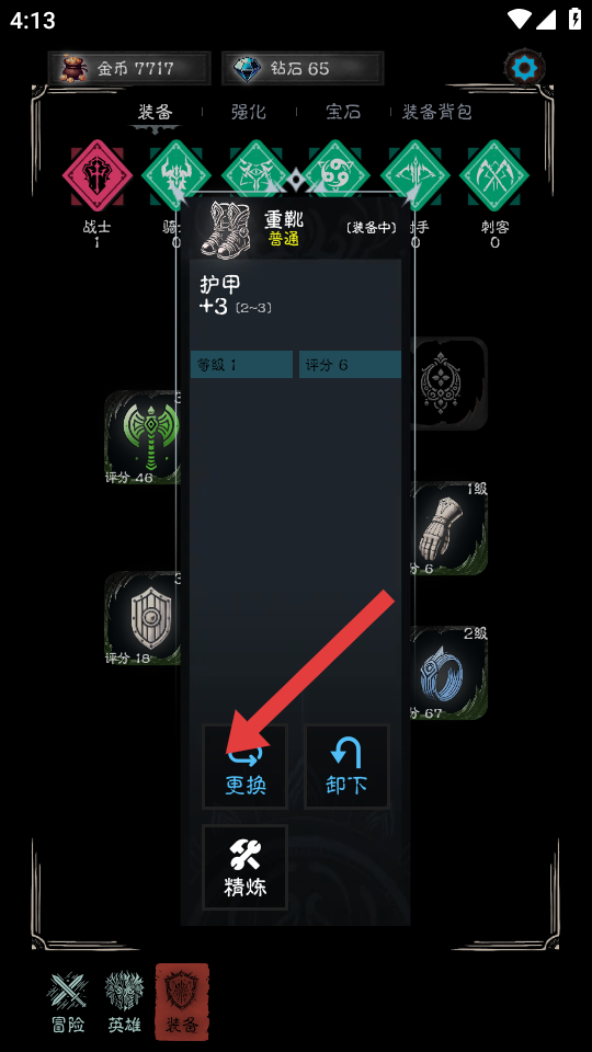 3、在装备详情界面,若当前装备如重靴需要更换,点击箭头指向的更换按钮,可选择其他更合适的装备为角色的配备。