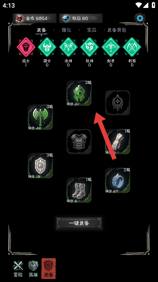 2、进入装备界面,看到箭头指向的装备如3级头盔,可点击查看装备属性,考虑是否为角色更换该装备,提升角色战力。