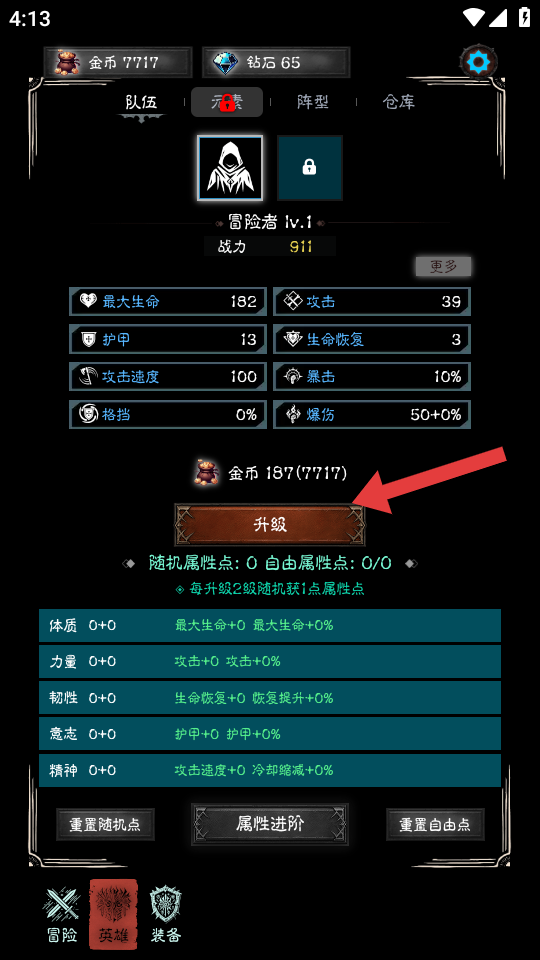 4、在英雄界面,点击箭头指向的升级按钮,消耗金币为冒险者角色升级,提升角色等级,增强角色在冒险中战斗能力。
