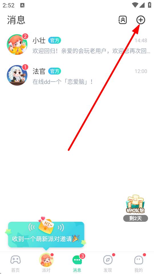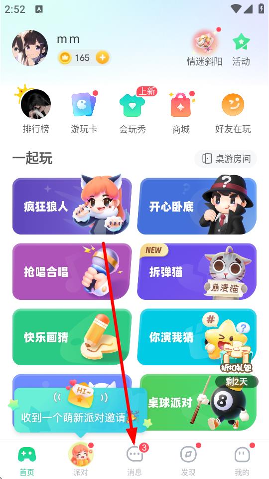 1、打开会玩app,进入主界面后点击底部导航栏中的消息选项。