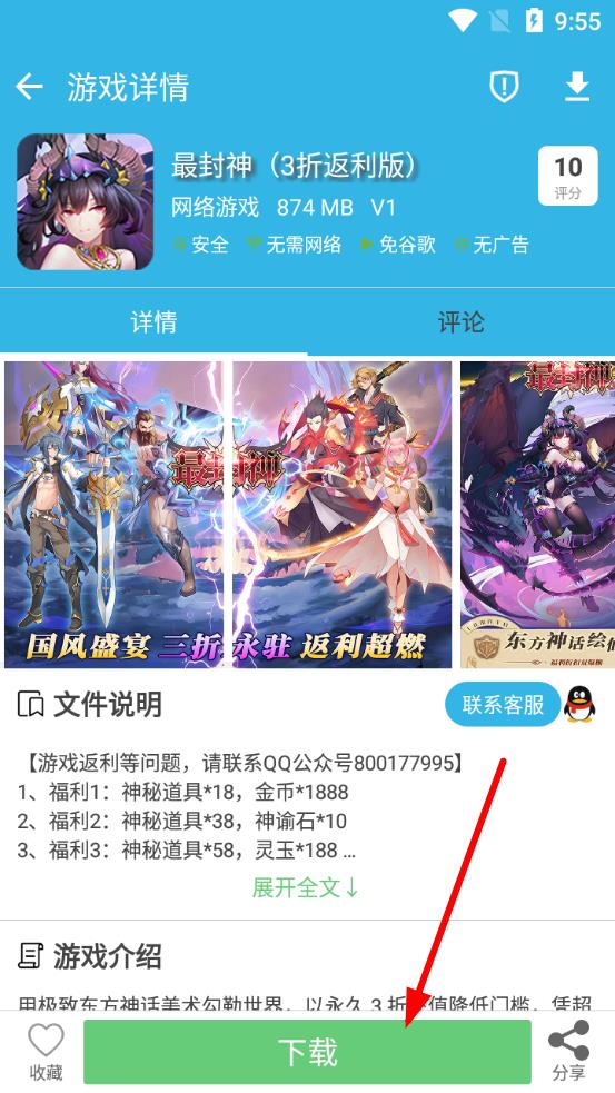 3、点击游戏进入详情页,查看游戏介绍、福利等信息后,点击下载按钮 ,下载安装完成后即可体验游戏。