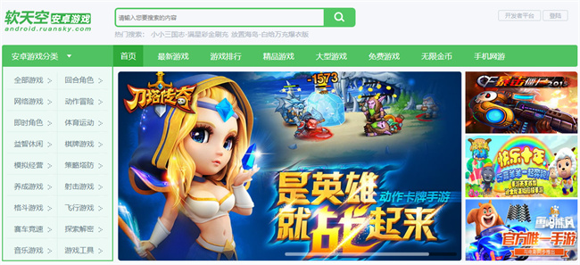 1、打开软天空官网,映入眼帘的是上方的游戏分类、游戏推荐以及导航栏目等,从这里可以找到一些热门游戏或者直达对应分类入口;