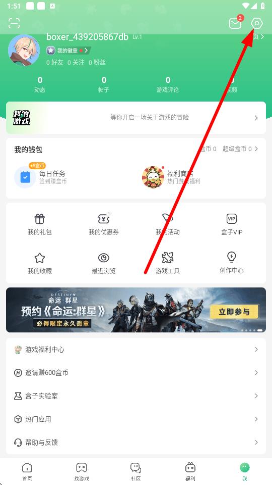2、进入我的页面后,点击右上角的齿轮设置图标。