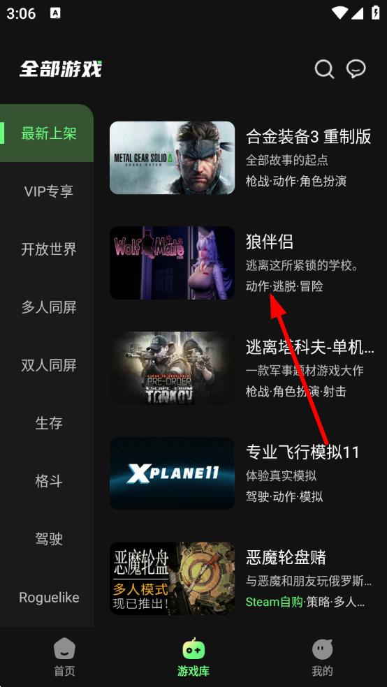 1、打开格来云游戏应用,点击底部导航栏中的游戏库,进入全部游戏页面。