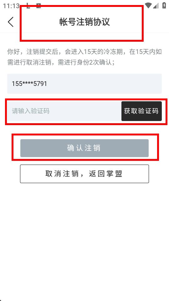 4、仔细阅读帐号注销协议,然后点击获取验证码,输入收到的验证码,点击确认注销。