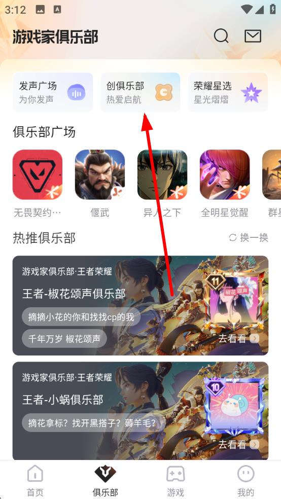 2、在游戏家俱乐部界面中,找到并点击创俱乐部按钮,进入创建俱乐部相关页面。