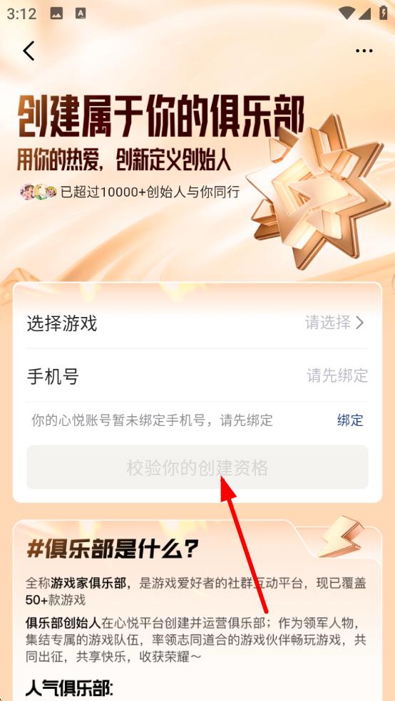 3、在创建俱乐部页面,按提示完成选择游戏、绑定手机号等操作,校验创建资格后即可进一步参与俱乐部相关活动。