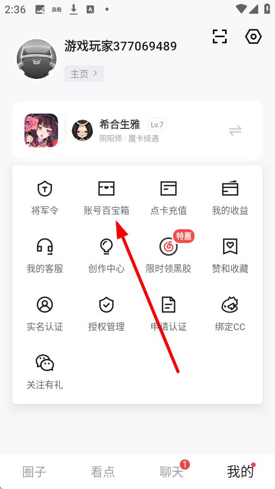 2、在我的页面中,找到并点击账号百宝箱功能按钮。