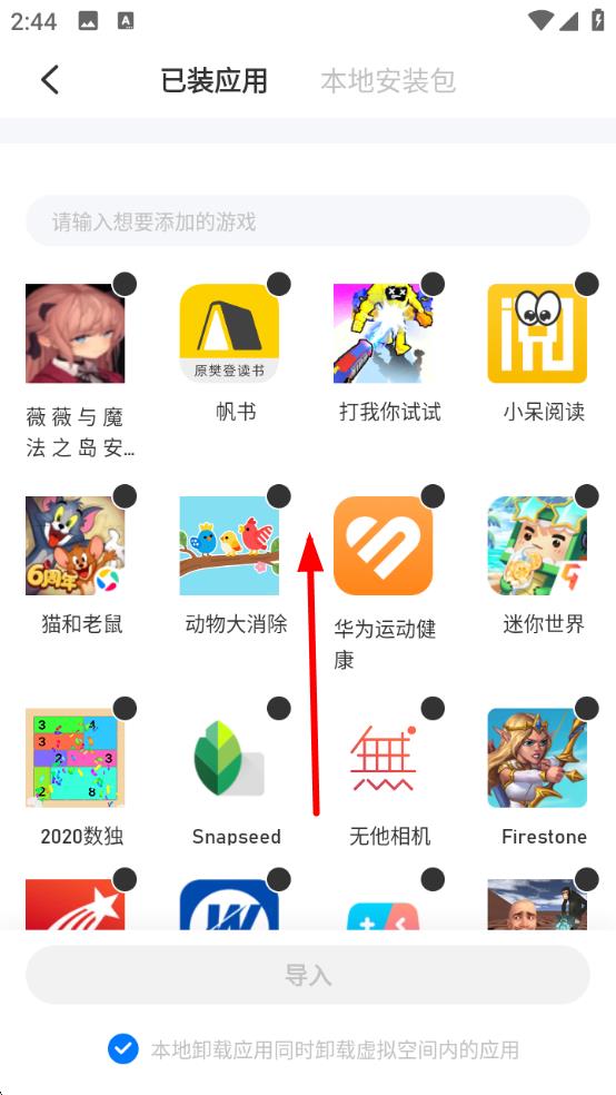 3、在应用列表中勾选要添加的游戏点击导入完成后点击游戏图标即可在虚拟空间运行。