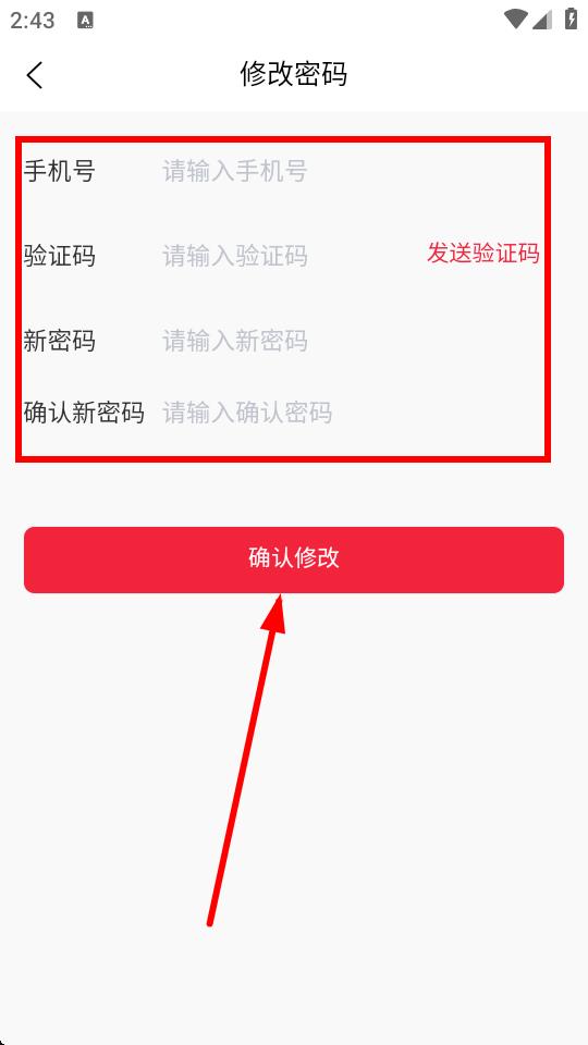 4、在修改密码页面,输入手机号并点击发送验证码,输入收到的验证码,再设置新密码并确认新密码,最后点击确认修改即可完成登录密码修改。