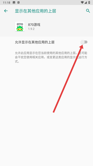 4、在进入到设置界面中,点击开关按钮,同意允许显示在其他应用的上层。