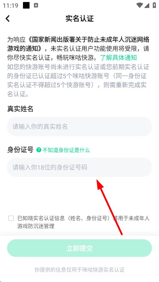 3、在实名认证页面,依次输入真实姓名和18位身份证号码 ,勾选知晓认证信息用途的选项后,点击立即提交,即可完成实名认证。