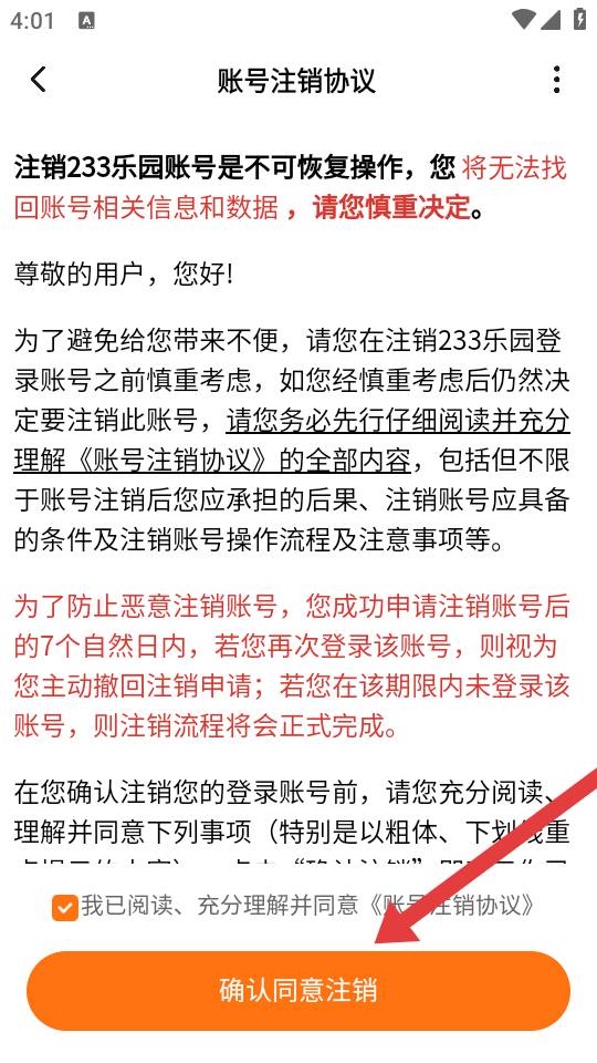 4、在账号注销协议页面,勾选注销协议后,点击确认同意注销按钮,完成账号注销申请。