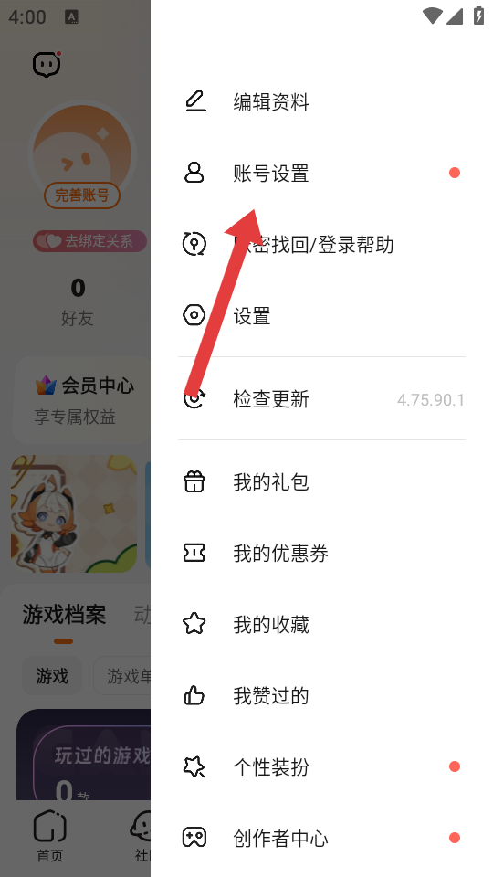 2、在侧边栏菜单中,点击账号设置选项,进入账号与绑定设置的页面。