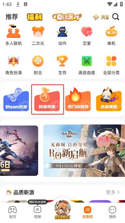 2、进入找游戏的页面中将会看到各种不同玩法类型专题选择,在这里可以看到【抖音热游】点击进入;