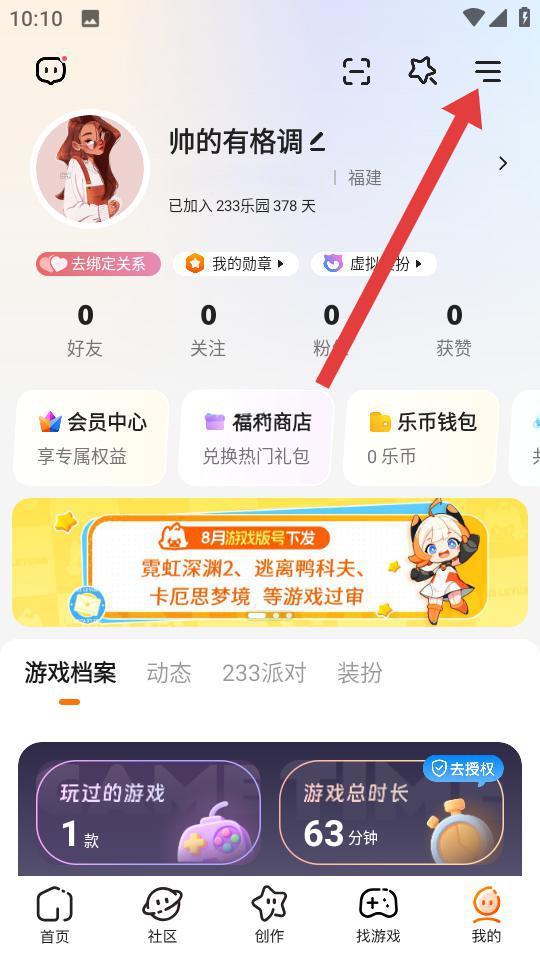 1、进入233乐园我的的页面后,点击右上角三条横线的菜单图标,展开系统功能列表。