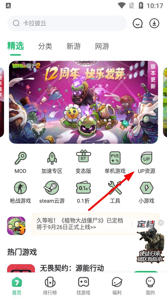 2、在首页界面中,找到UP资源选项并点击进入UP资源页面。
