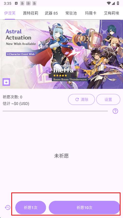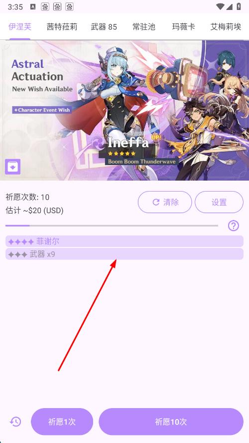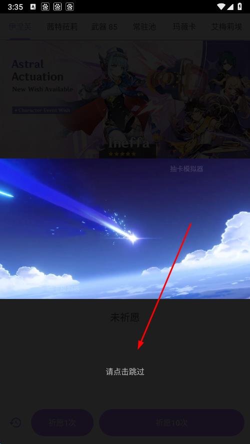 1、进入抽卡模拟器界面,在界面下方找到祈愿1次或祈愿10次按钮,点击按钮。