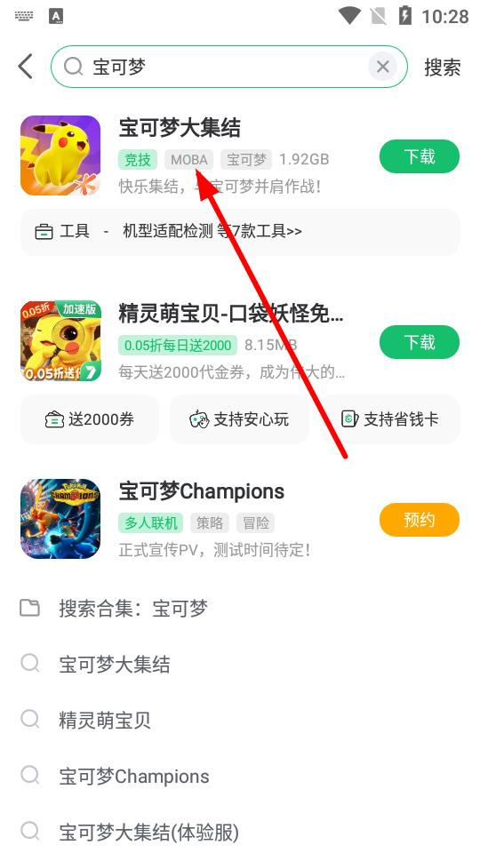 2、在搜索框中输入宝可梦,点击搜索后,在结果中找到如宝可梦大集结等感兴趣的游戏。
