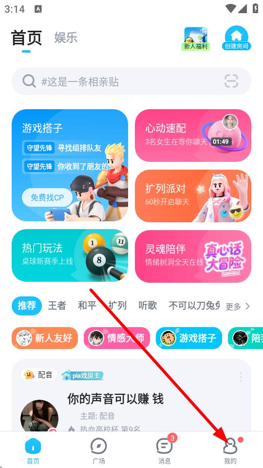 1、打开tt语音App进入首页,点击底部导航栏中我的选项进入个人页面。