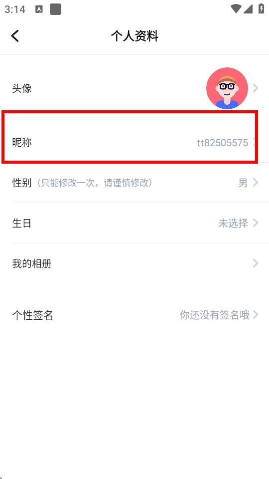 3、在个人资料界面中,找到昵称选项并点击进入昵称修改界面。