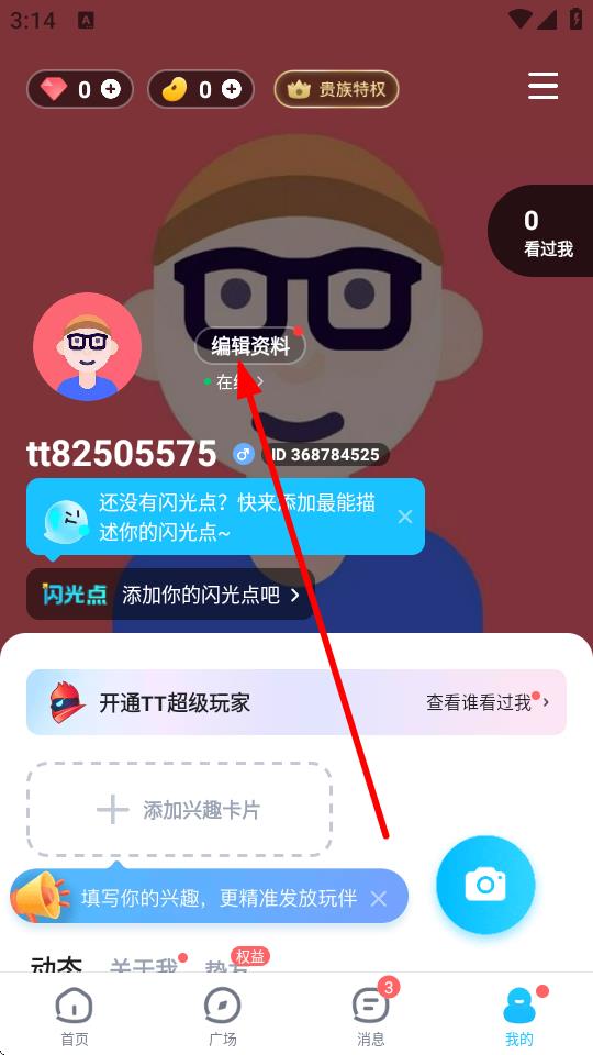 2、在个人页面里,点击头像下方的编辑资料按钮进入个人资料编辑界面。