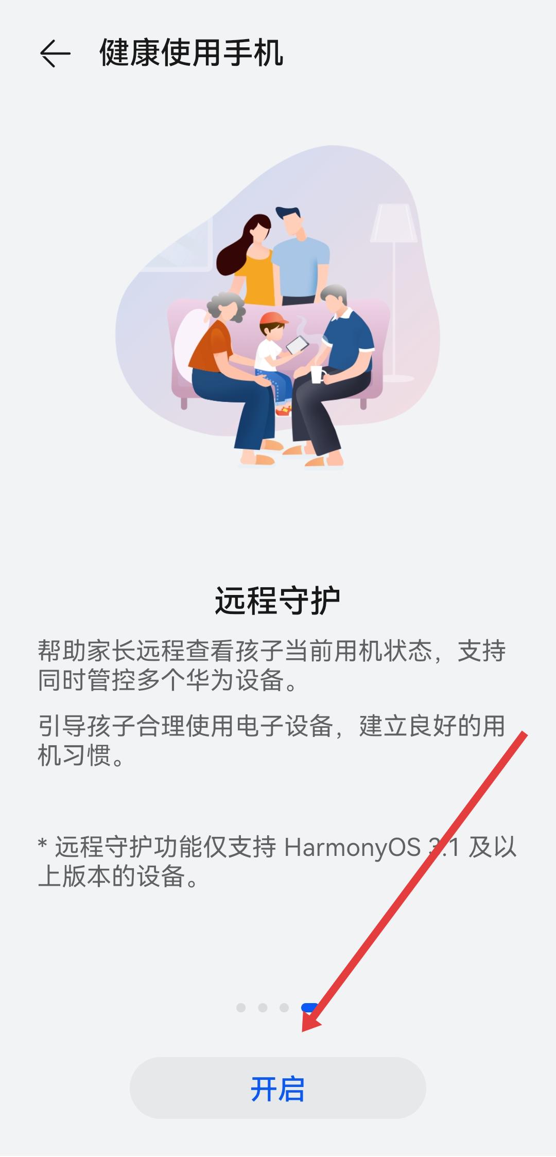 3、在健康使用手机的页面,点击开启的按钮,进入使用者选择流程。
