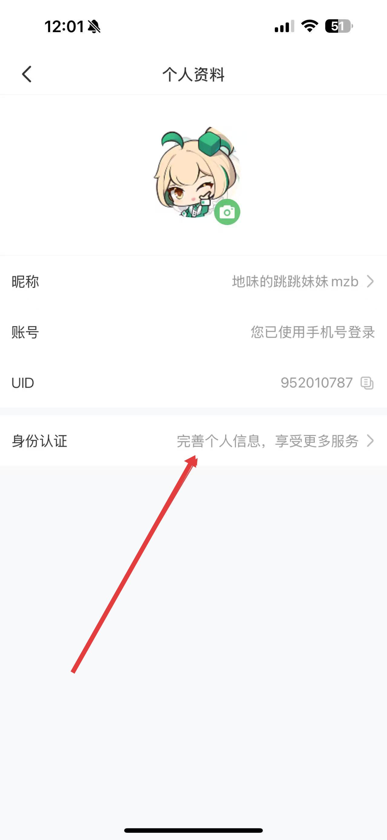 3、在个人资料界面,找到身份认证选项,点击完善个人信息,按提示填写相关信息完成实名认证。