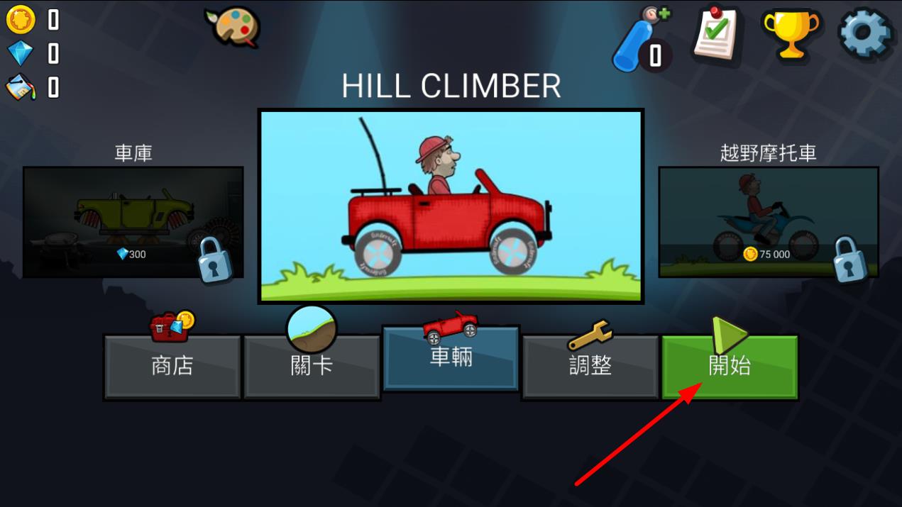 2、选择自己心仪的载具,或者花费钻石、金币解锁如越野摩托车等更多车辆,选好车后,点击开始按钮进入关卡挑战。