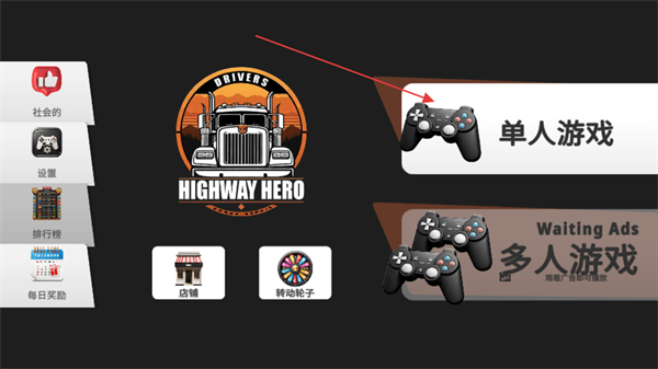 1、这是车手公路英雄主界面,点击单人游戏可进入单人游玩模式,界面还设有店铺等功能入口供你使用。