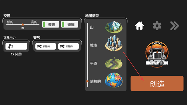 2、在该游戏的设置界面,可调整交通、地图类型等参数,完成设置后点击创造按钮即可进入对应的游戏模式。