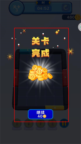 4、所有积木匹配对应区域后完成关卡,界面显示关卡完成和金币奖励,点击继续按钮花费40金币进入下一关。