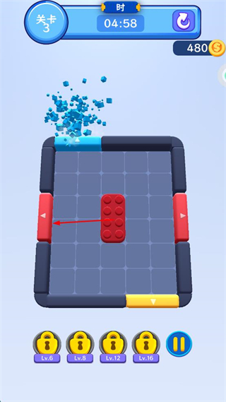 3、蓝色积木匹配顶部蓝色区域后消除,红色积木按箭头指示向左移动,匹配左侧红色区域。