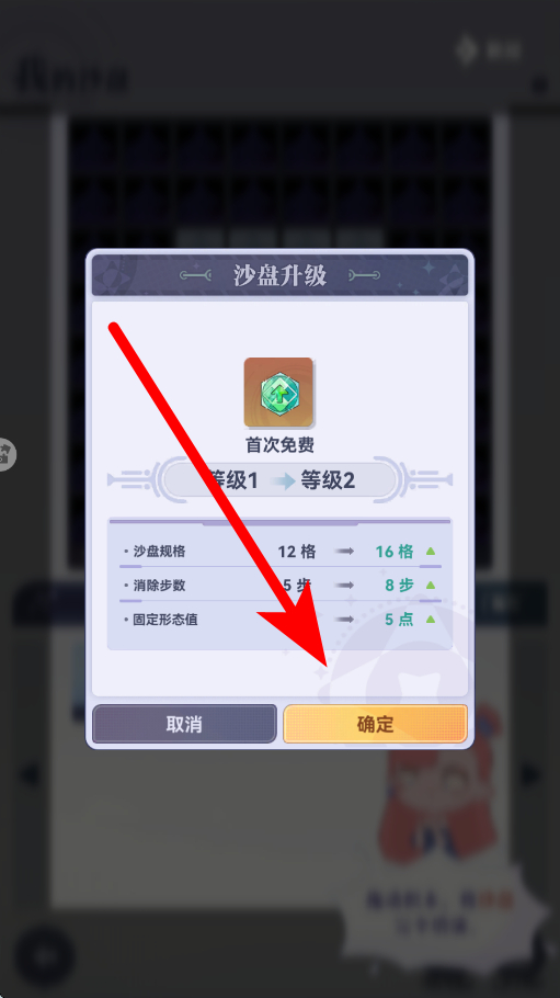 4、升级沙盘要在沙盘升级界面,查看升级后的沙盘规格、消除步数等提升情况,确认后点击确定,完成沙盘升级,获得更好的游玩体验。