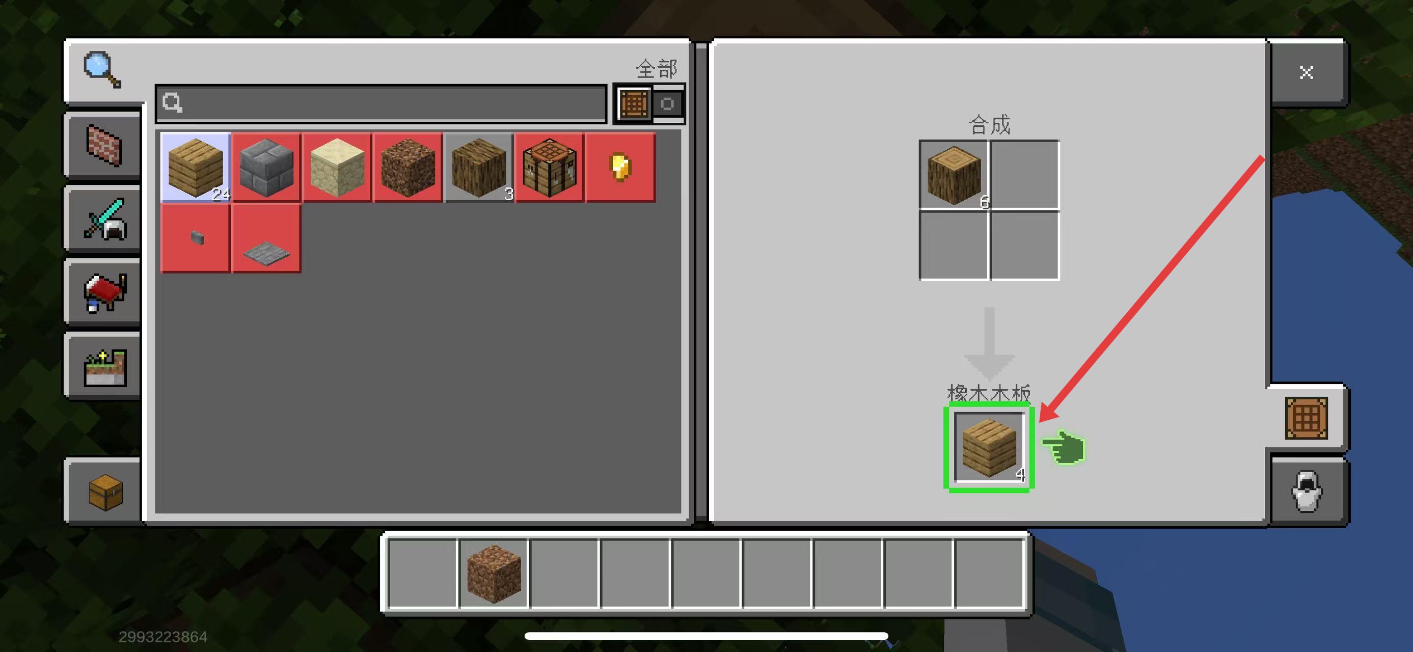 2、在合成界面,选中左侧原木,将其放入右侧合成网格,进行木板合成操作。