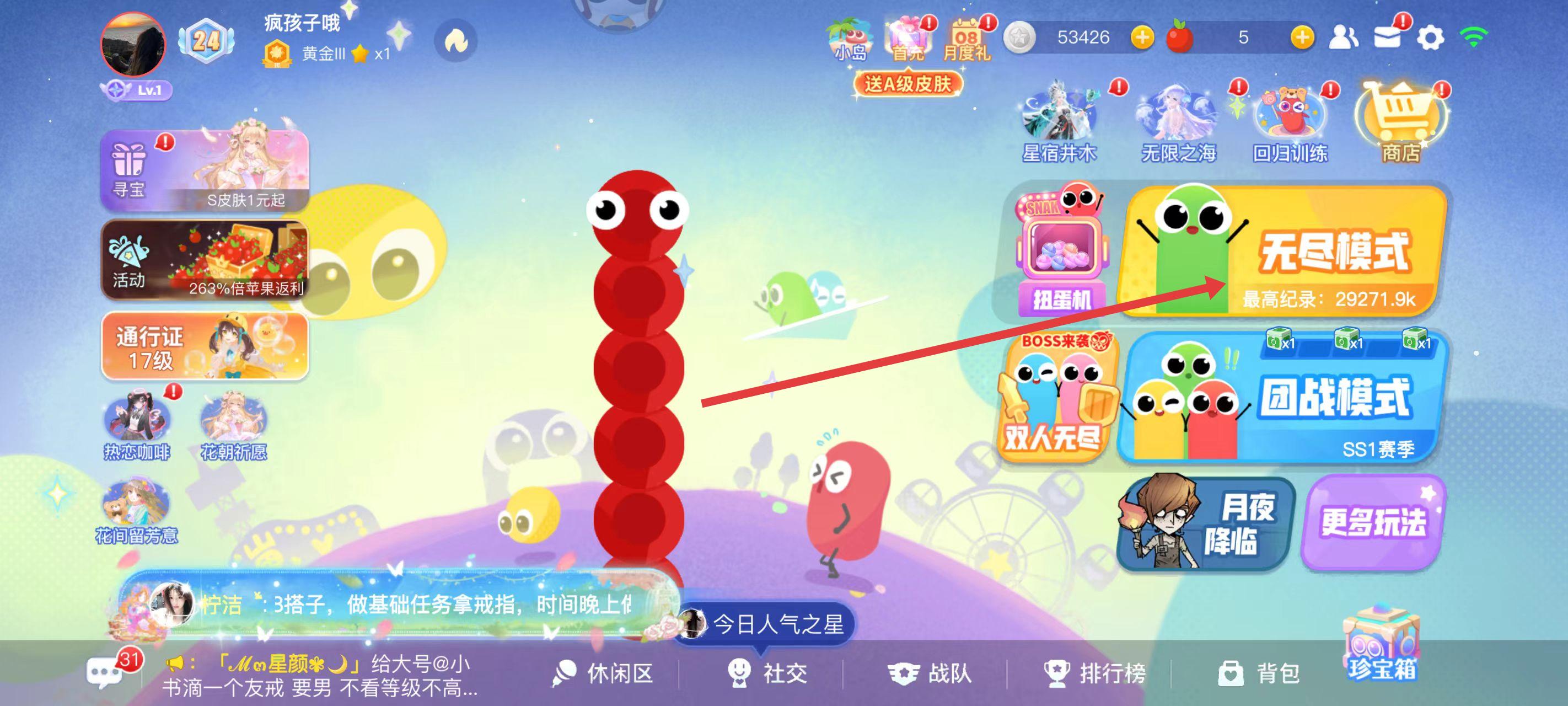 1、进入贪吃蛇大作战主界面,点击无尽模式按钮开启游戏,尽可能多的吃掉这些光点,这能让你的贪吃蛇快速增长长度,提升竞争力。