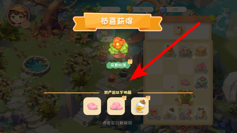 3、利用花瓶生产要在拥有花繁叶茂等物品后,点击花盆,使其进行生产,产出相应的物品,丰富经营的成果,提升经营的效益。