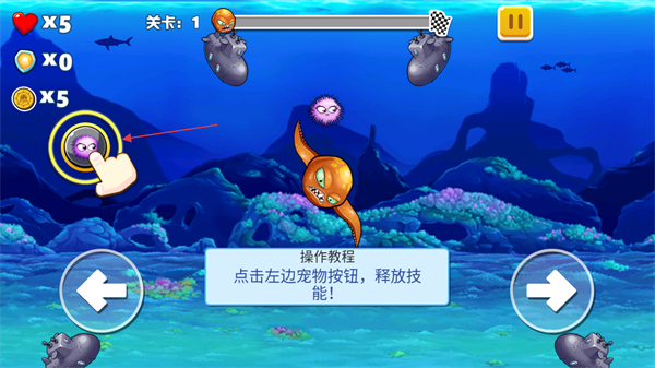 2、点击左侧宠物按钮释放技能,击败敌人,完成关卡的操作教程,推进通关流程。
