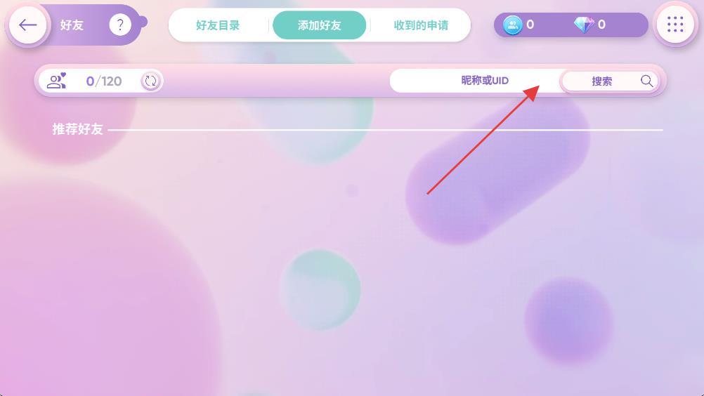 4、在搜索框中输入对方的昵称或UID,发送添加申请即可。