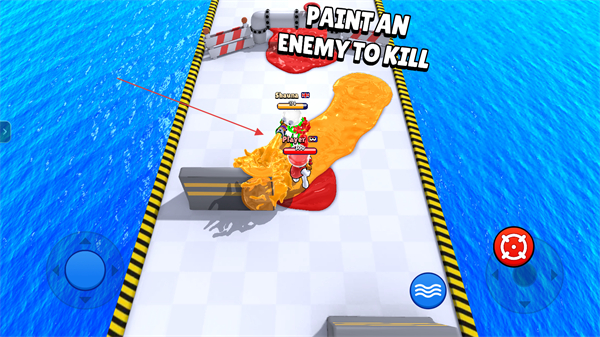 2、点击界面右侧的红色瞄准按钮,即可操控角色发射油漆,发射的油漆会覆盖地面与目标,需结合移动调整角度以提升覆盖效率。