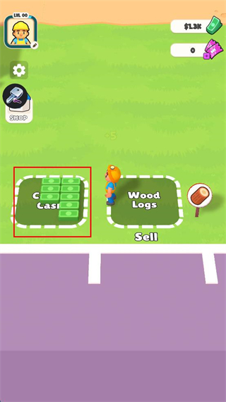 4、到达售卖区域,将木材放入WoodLogs售卖点,成功获得Cash金钱,界面清晰显示现金区域和木材售卖区域。