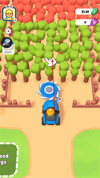 2、驾驶蓝色伐木车,按照手指指示前往树林区域,开始伐木作业,周围有红绿相间的树木等待砍伐。