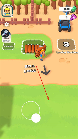 3、伐木后搬运木材至WoodLogs区域,木材堆到MAX后,根据SELLLOGS提示前往售卖点,准备出售木材获取收益。