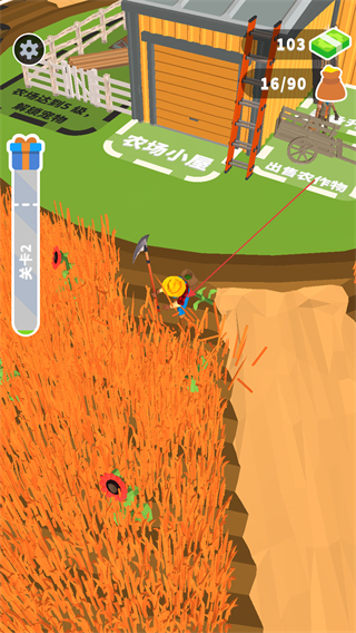 1、操控角色在农田中收割农作物,同时挖掘土地获取资源,积累农作物数量。