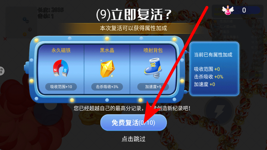 3、复活要在角色面临失败时,选择免费复活,获得属性加成,继续参与竞技,争取更好的竞技成绩,延长游玩的时长。