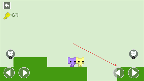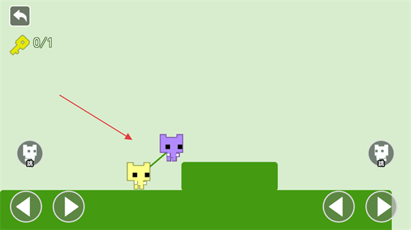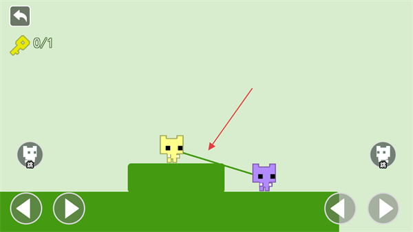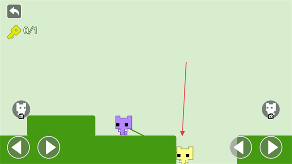2、当遇到高低差地形时,控制其中一个角色移动,带动另一个角色越过障碍,如让黄色角色先下台阶,紫色角色随之移动。
