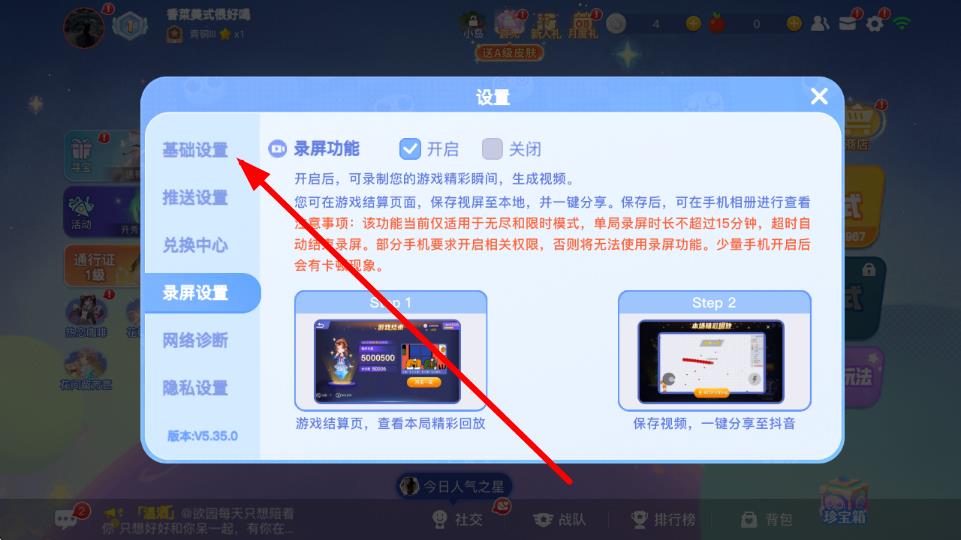 2、在设置界面中,点击左侧列表里的基础设置选项,页面右侧会展示出一系列基础设置内容,涵盖音效、画质等多种设置选项。