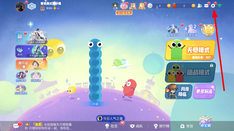 1、进入贪吃蛇大作战游戏主界面,点击右上角设置图标齿轮形状,进入设置界面,在这里可以对游戏的各项参数进行调整。