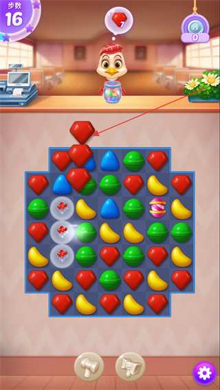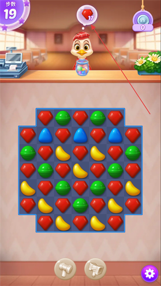 2、观察糖果棋盘,通过交换相邻糖果,让3个及以上相同糖果连成一线,触发消除并收集红宝石。