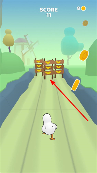 2、奔跑过程中点击屏幕左右区域可控制鸭子左右、下蹲、跳跃,躲避道路中间或两侧的障碍物,如木栅栏、施工路障等。